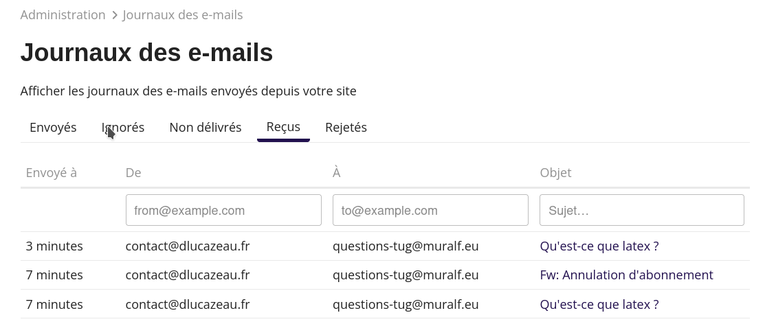 À toutes fins utiles, les sujets et dates des deux courriels que j’ai expédiés :