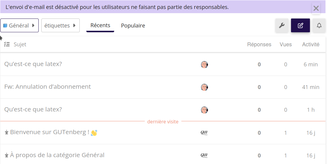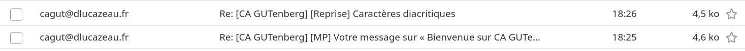 J’ai répondu à deux messages par courriel : l’un, privé, de Daniel ; l’autre, public, sur le fil « caractères diacritiques ». Pour l’instant, je ne les vois pas dans l’interface web.